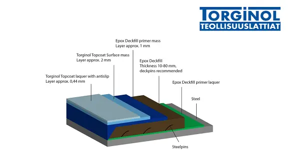 Suomalaisia Torginol- ja Epox-Torginol-laivankansimassoja käytetään sisä- ja ulkorakenteissa 4 – 80 mm:n kerrospaksuuksina. Joustavat ja kestävät Torginol-laivankansipäällysteet kestävät värähtelyä, alustan muodon muutoksia, suuria lämpötilanmuutoksia ja säärasitusta.